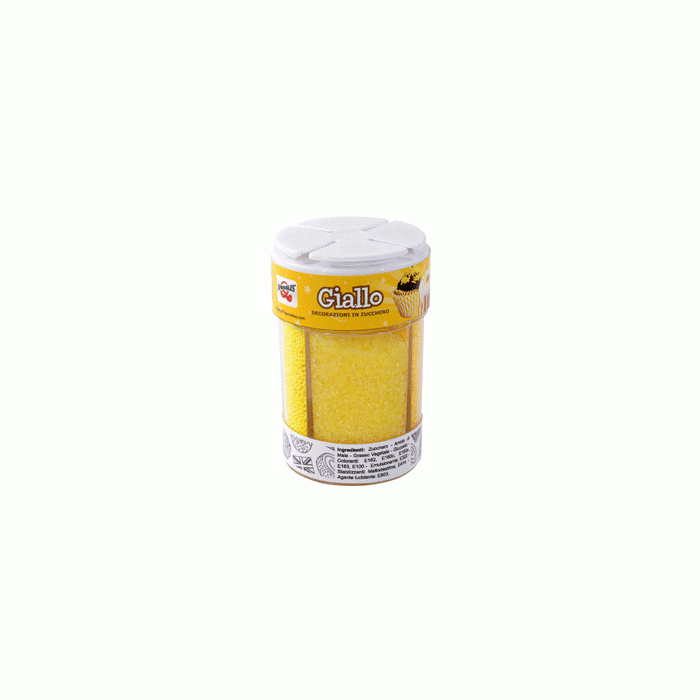 Confetti comestible jaune, en sucre, boite distributrice de 126 grammes. Un décor alimentaire pour saupoudrer ses pâtisseries préférées au gré de ses envies.