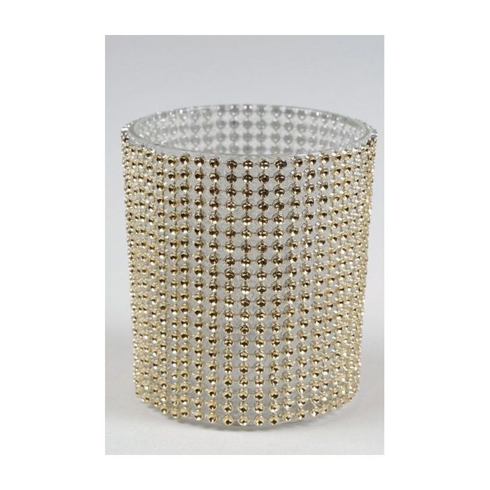 De dimensions 7,5 x 8,5 cm, ce photophore est en verre, incrusté de pierres scintillantes, et de couleur dorée.